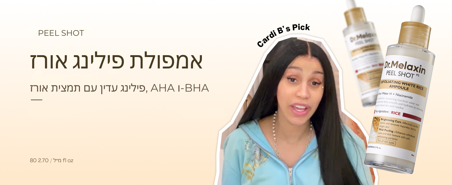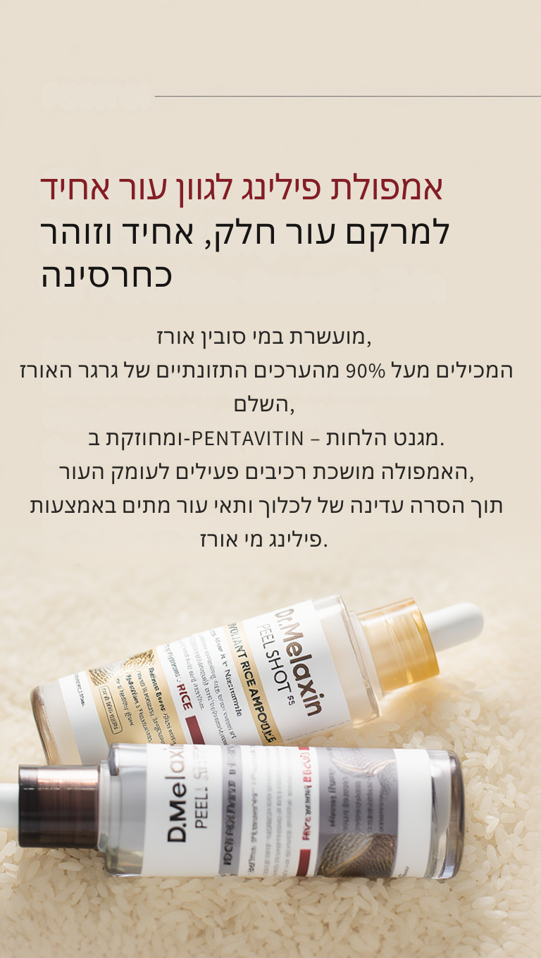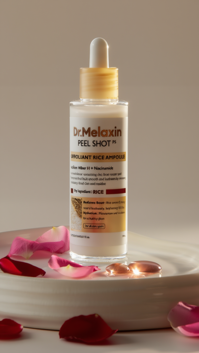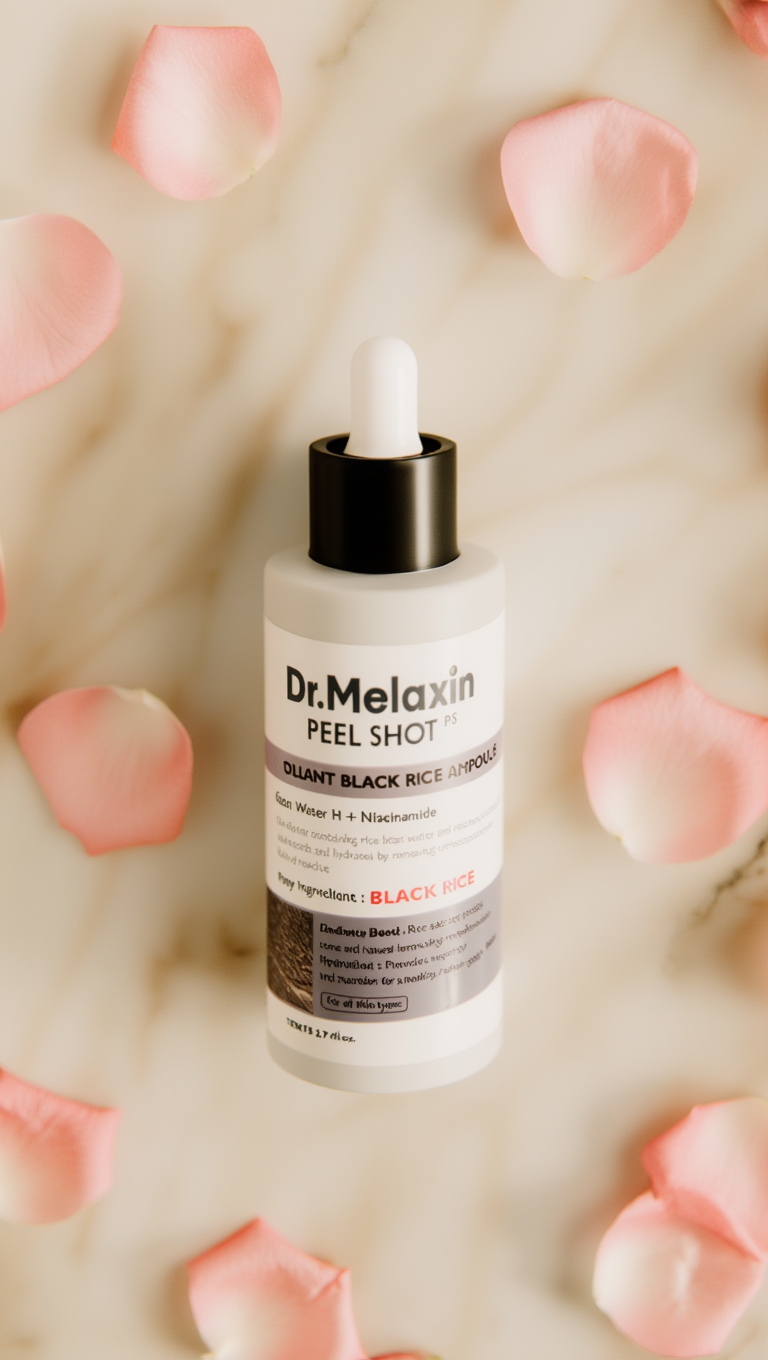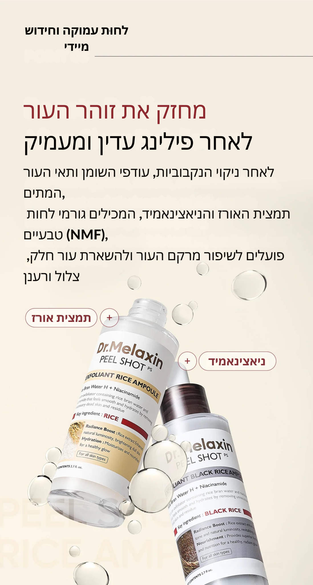 Dr. Melaxin PEEL SHOT עם תמצית אורז לבן מעניק פילינג חכם ועדין שמסיר תאים מתים ולכלוך עמוק בלי לגרות את העור.